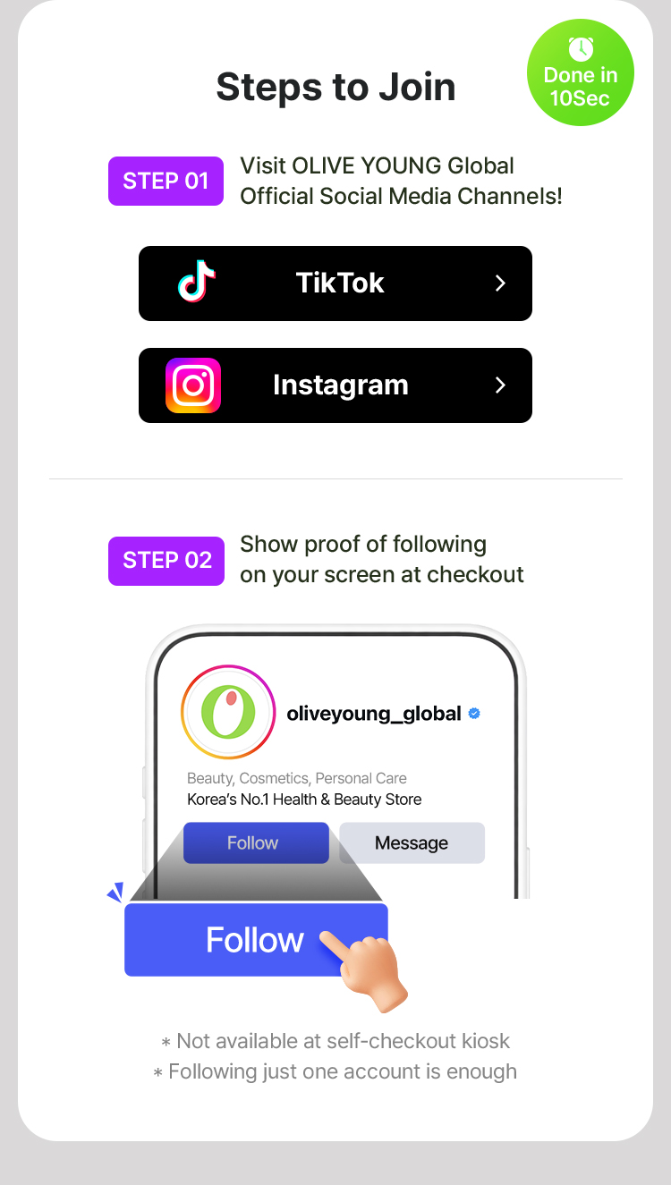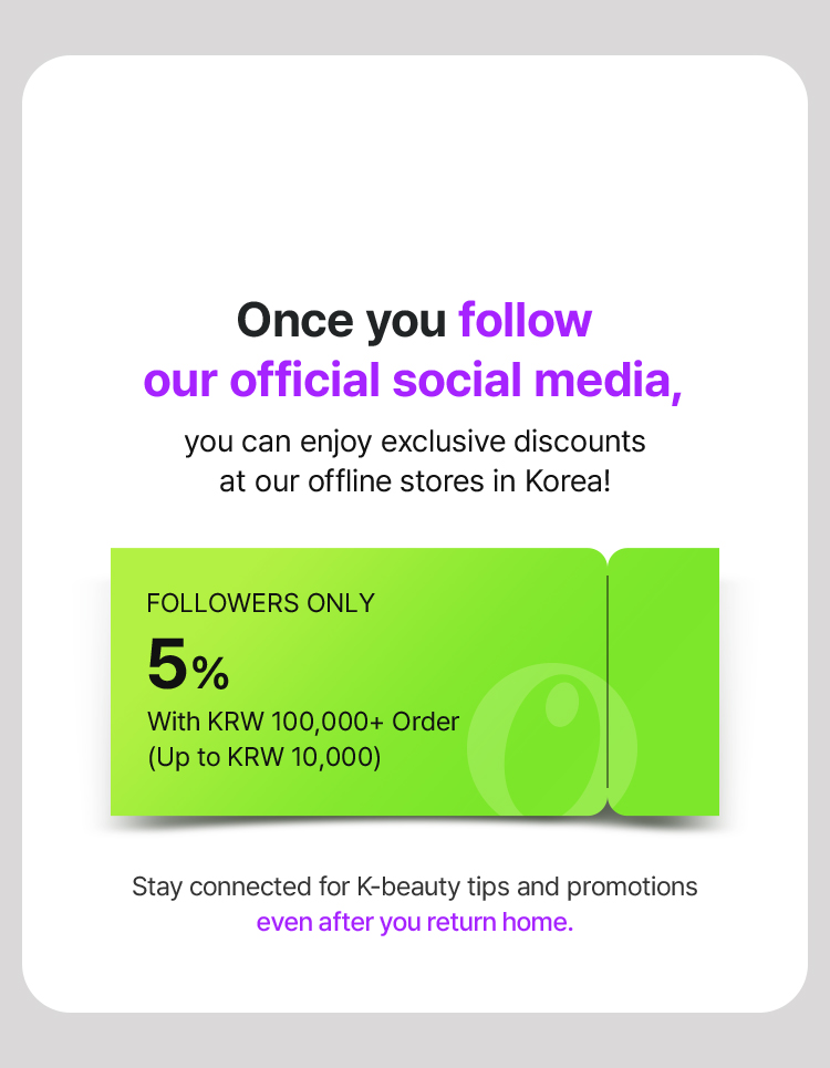 Follow OLIVE YOUNG Global on Social Media and Enjoy 5% OFF instantly (up to KRW 10,000)