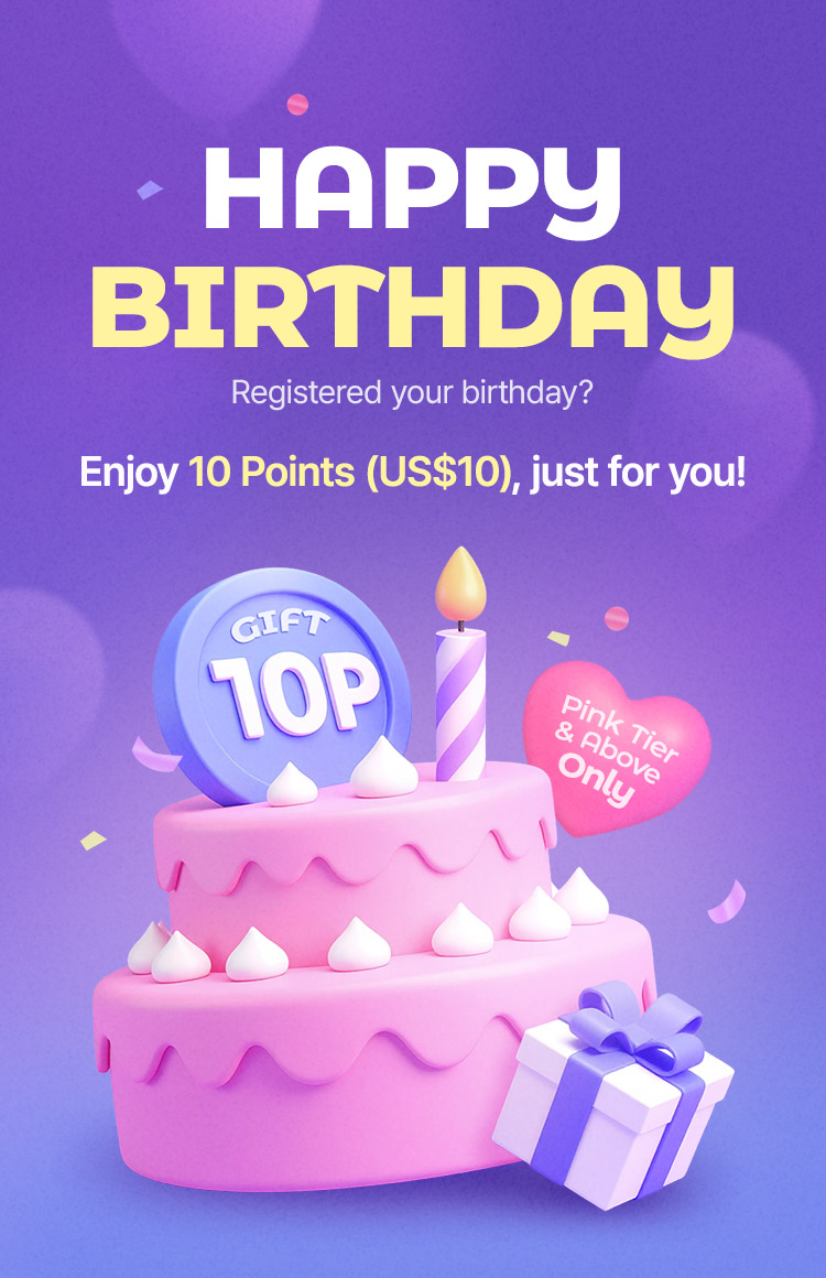 - A 10-point birthday gift (equivalent to US$10) will be automatically issued 7 days before your registered birthday. (Your birthday must be registered at least 8 days in advance.)