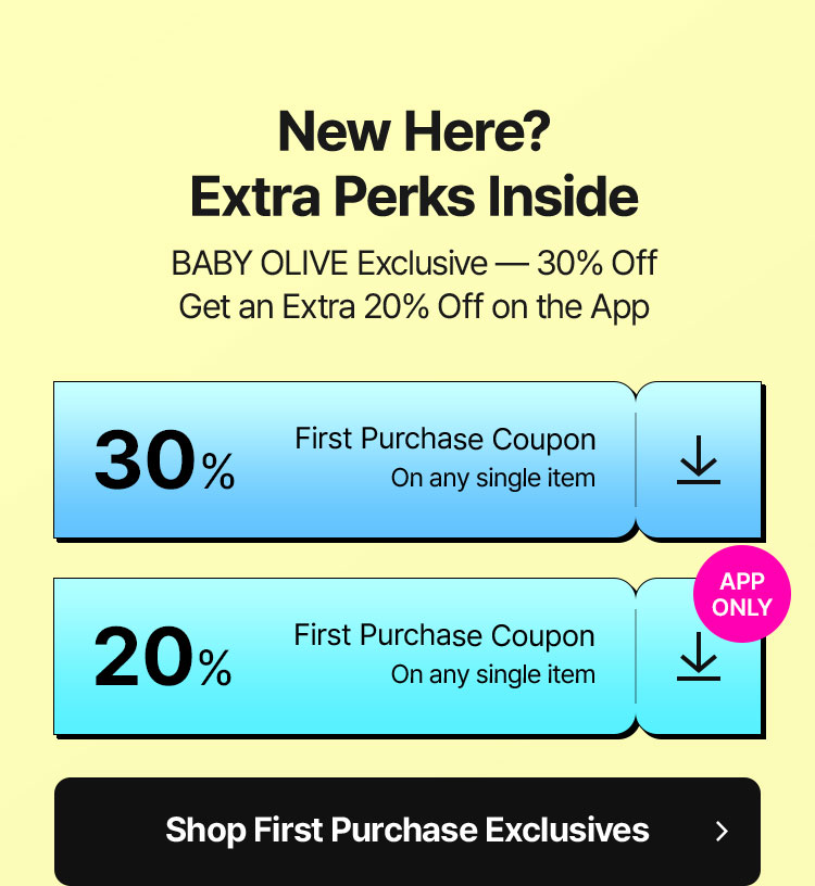 - First Purchase Only 30% OFF & 20% OFF coupon(APP ONLY) is only available for BABY OLIVE members.