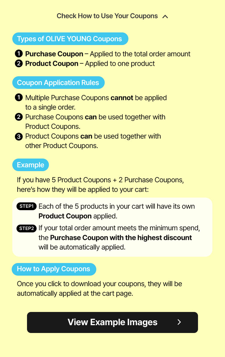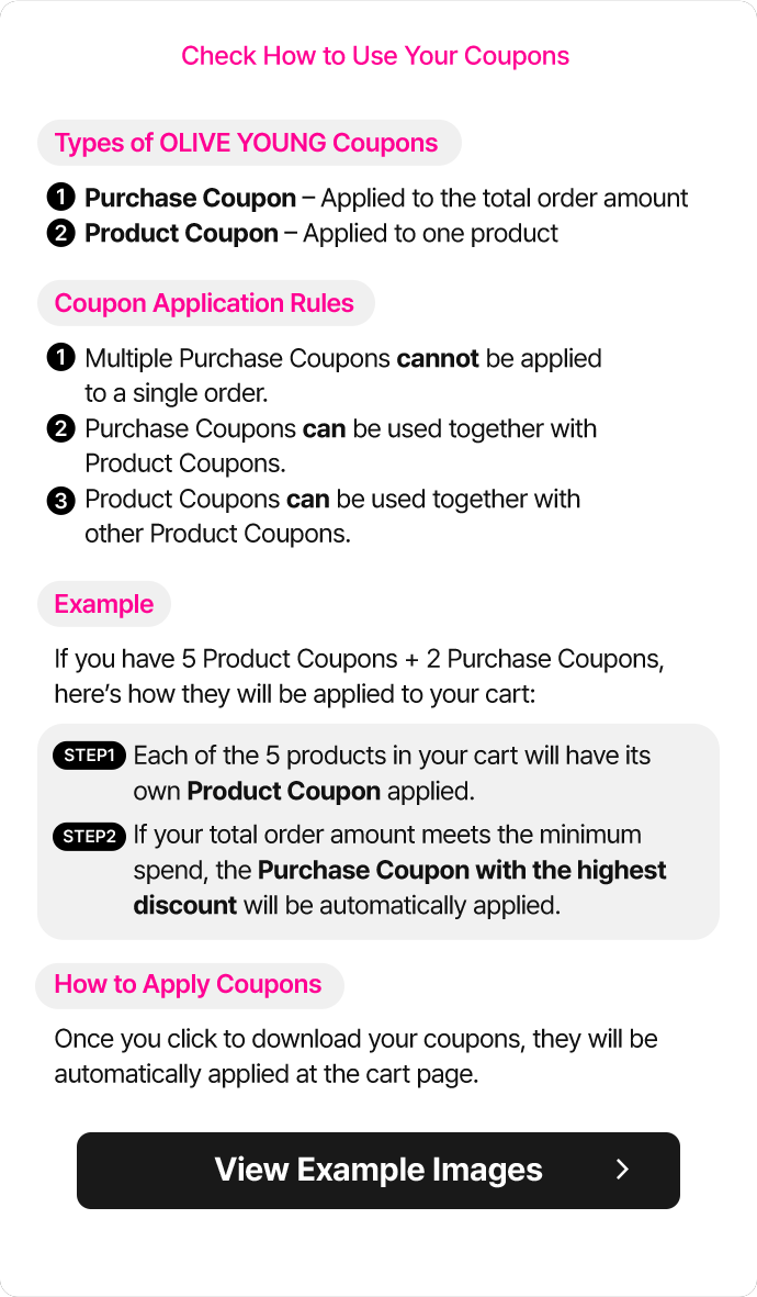 - Exclusions apply to certain brands : K-POP, LANEIGE, AESTURA, MEDIHEAL, S.NATURE, Tovegan, La'dor, NACIFIC, Medipeel, and goodal single sheet masks.