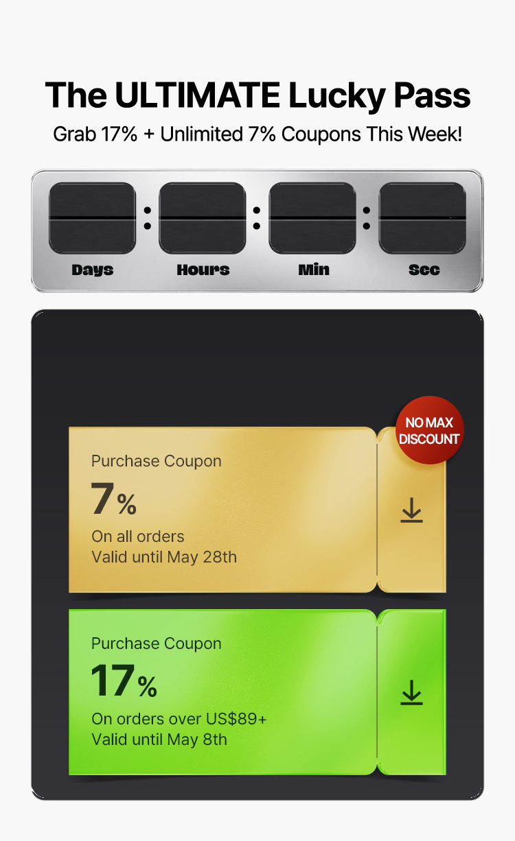 7% OFF (no minimum spend, no maximum discount) – issued during Week 1 and valid from May 1 to May 28