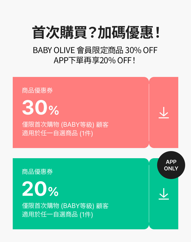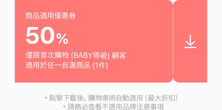 *本優惠券限每組 ID 領取及使用一次,僅限 BABY (新會員) 發放。